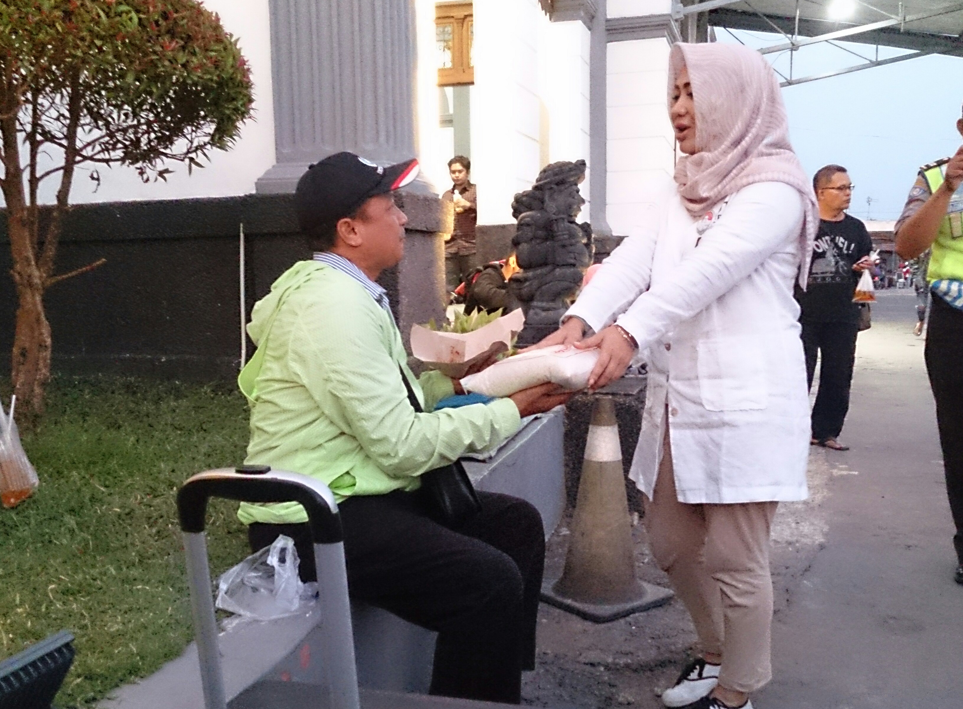 Di Gladag dan Stasiun Jebres Solo, membagikan paket sembako dibagikan kepada pemudik.