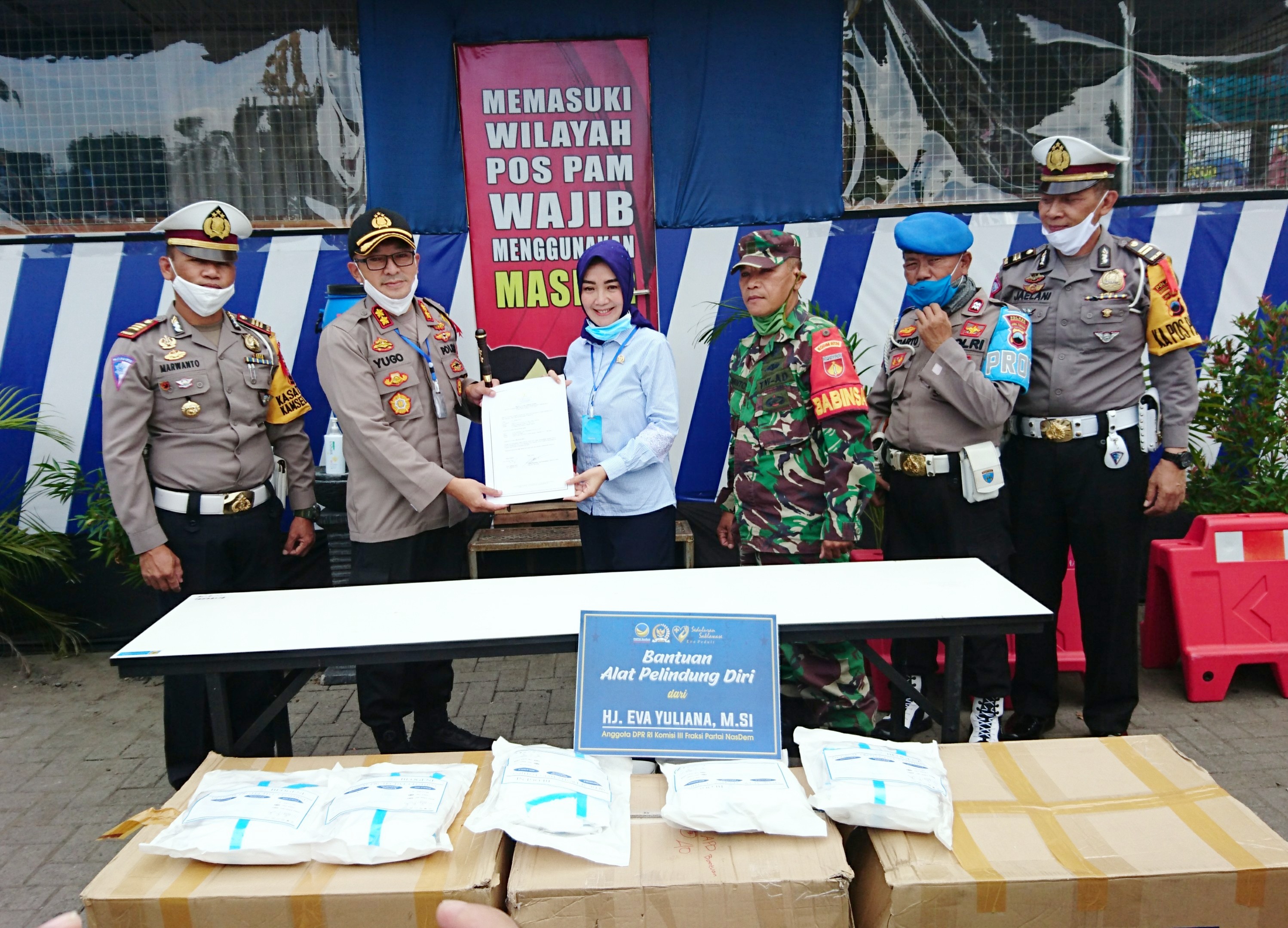 SOLO (LN) – Anggota DPR RI Komisi III Eva Yuliana kunjungi Kabupaten Sukoharjo, Kamis (14/5). Eva menyalurkan bantuan Alat Pelindung Diri (APD) pada Polres Sukoharjo. Bantuan diberikan disela-sela kunjungan Eva ke Pospam Terpadu Penanganan Virus Corona di Bundaran Pandawa Solo Baru, Grogol. Bantuan diterima oleh Kapolres AKBP Bambang Yoga Pamungkas.