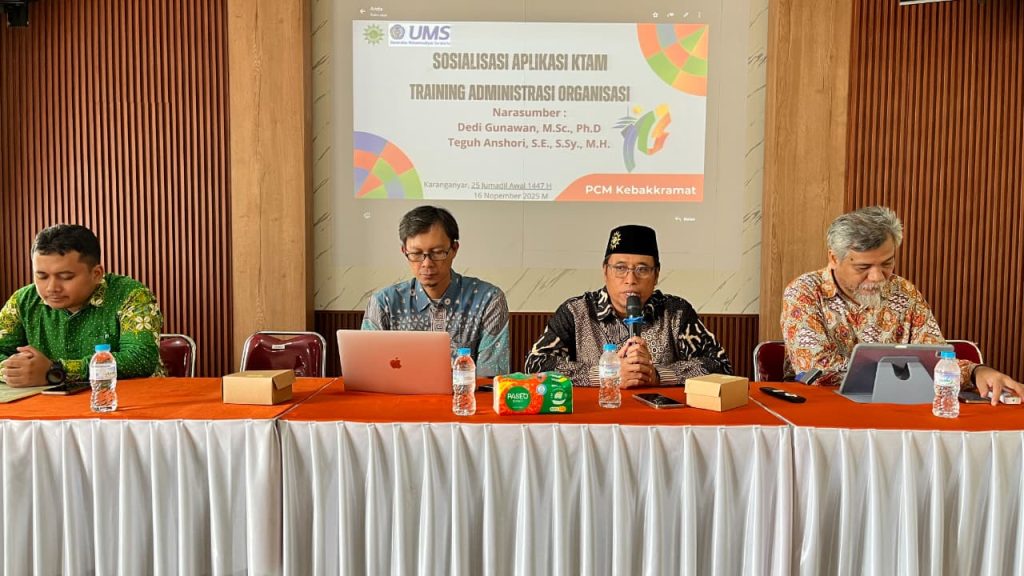 KARANGANYAR – Universitas Muhammadiyah Surakarta melalui tim pengabdian masyarakat penerapan teknologi tepat guna (P2TTG) kerjasama dengan cabang Muhammadiyah Kebak kramat gelar sosialisasi dan pelatihan aplikasi untuk pengurus cabang dan Ranting Muhammadiyah di era gempuran serba digital senin,(17/11/25).