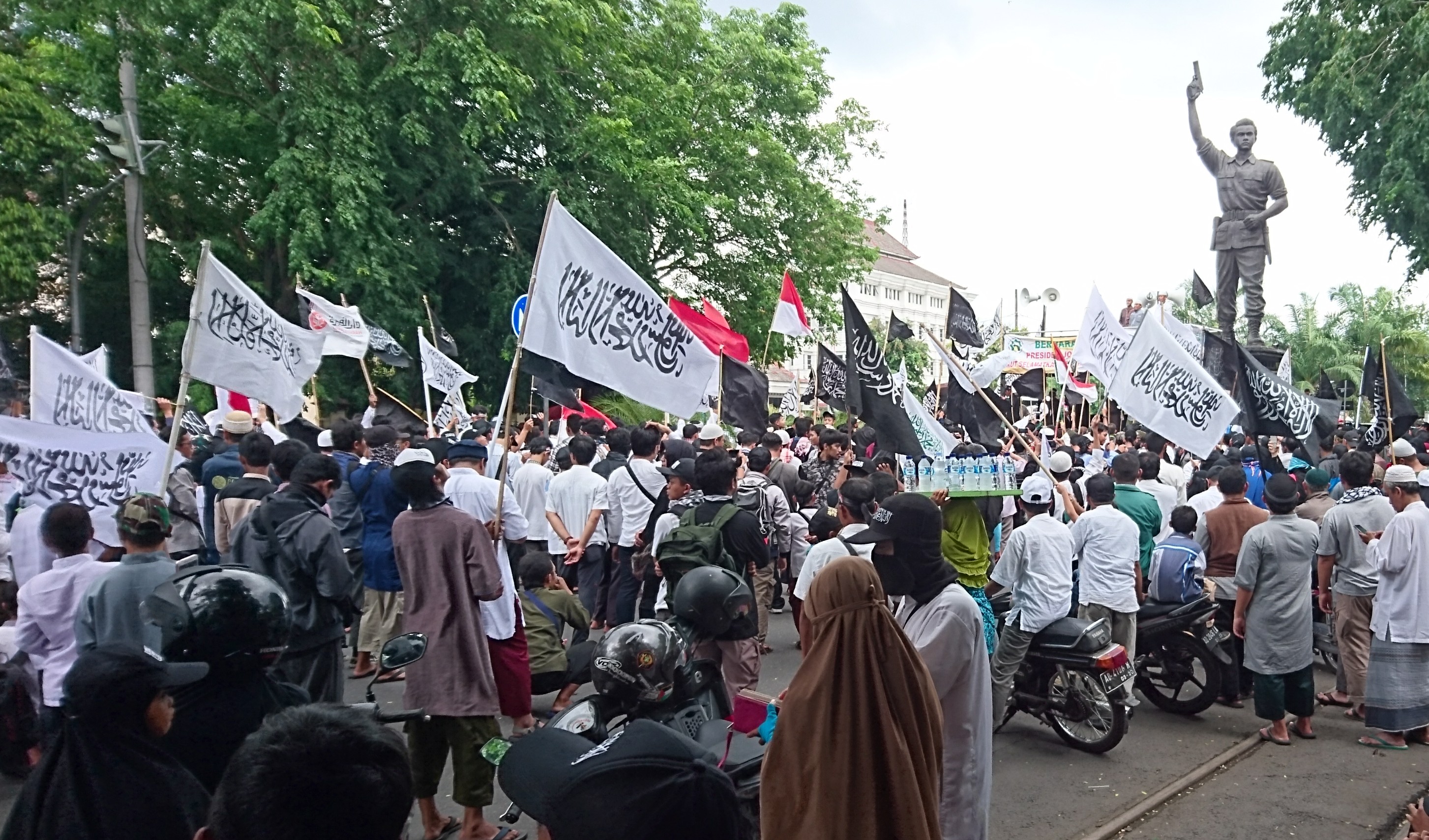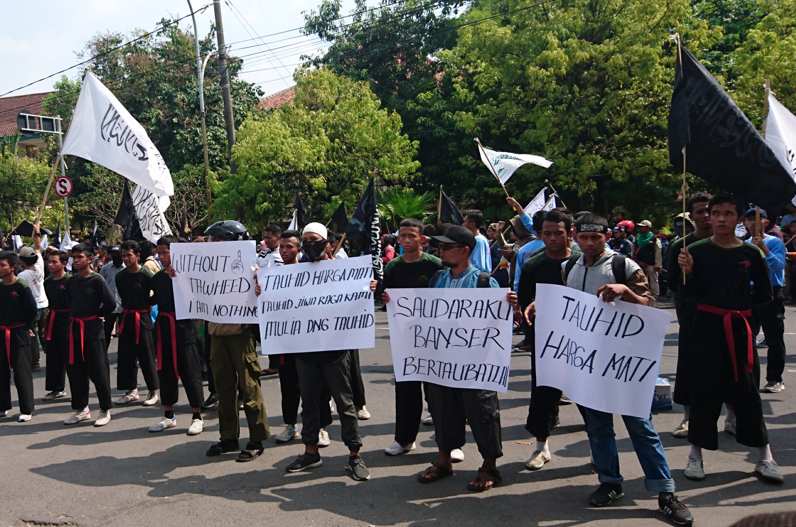 24 October 2018SOLO (LN) – Ribuan orang dari berbagai elemen umat Islam yang tergabung dalam Komunitas Nahi Munkar Surakarta (Konas) menggelar aksi demo di depan kantor Pengurus Cabang Nahdatul Ulama (PCNU) Solo, Selasa 23 Oktober 2018. Demo itu dilakukan sebagai buntut dari aksi oknum Banser yang membakar bendera tauhid di Garut, Jawa Barat. Massa datang dengan menggunakan kendaraan