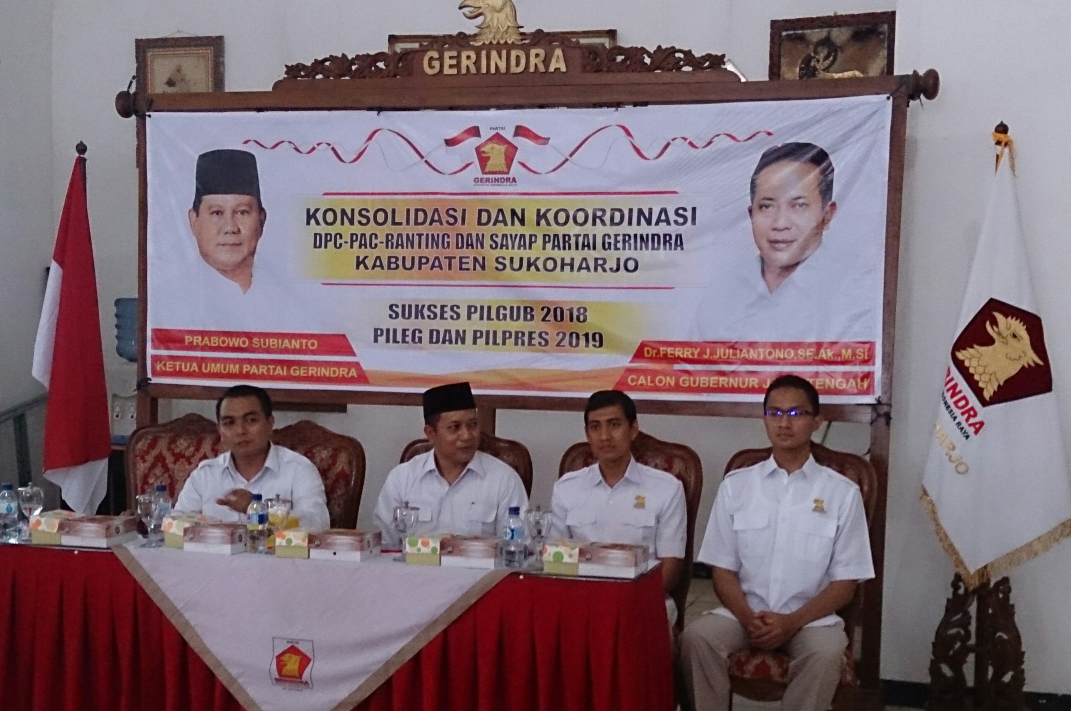 7 November 2017SUKOHARJO (LN) – Bakal calon Gubernur Jawa Tengah, Ferry Joko Juliantono, SE, .Ak M.si yang bakal jadi calon Gubernur Jawa Tengan yang di usung dari Partai Gerindra. Dalam acara Koordinasi DPC-PAC-RANTING dan Sayap-sayap partai Gerindra Kabupaten Sukoharjo. Selasa (7/10/2017). Motifasi Ferry datang ke Jawa Tengah untuk menerima mandat dari musyawarah daerah Jawa Tengah Partai Gerindra